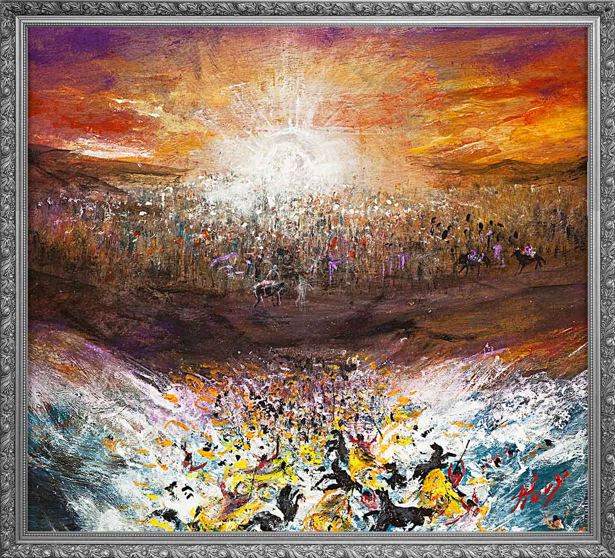 מבט פנורמי עוצר נשימה על בקיעת ים סוף, המציג אלפי בני ישראל זורמים דרך השביל הנסי. הובי לוכדת את הקנה המידה המונומנטלי של יציאת מצרים עם חומות מים מתנשאות משני הצדדים ואור אלוהי קורן מלמעלה. מרכבות המצרים בחזית מוסיפות דרמה ודחיפות לרגע מכונן זה של גאולה ואמונה