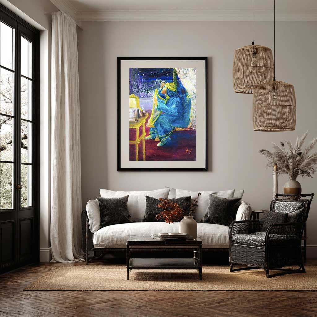 דמות המלך דוד בליל ירושלים, נשענת על כינורה ושרה שירת הלל לאלוהים, מתעוררת לחיים בציור מרתק זה. כחול גלימת המלך מתמזג עם כחול הלילה של ירושלים העתיקה, והכמיהה עולה מתוך החשכה והופכת לאור זהוב.