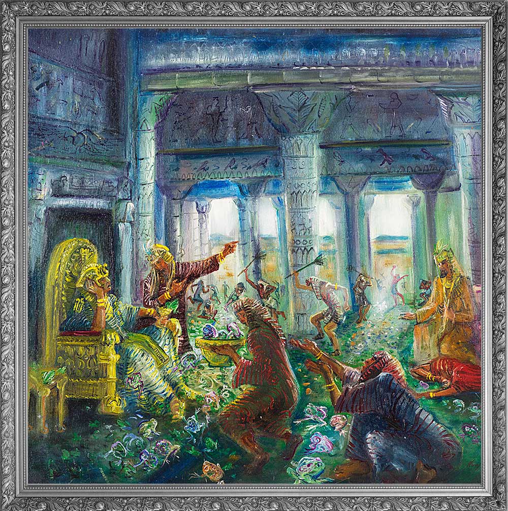 דמות המלך דוד בליל ירושלים, נשענת על כינורה ושרה שירת הלל לאלוהים, מתעוררת לחיים בציור מרתק זה. כחול גלימת המלך מתמזג עם כחול הלילה של ירושלים העתיקה, והכמיהה עולה מתוך החשכה והופכת לאור זהוב.