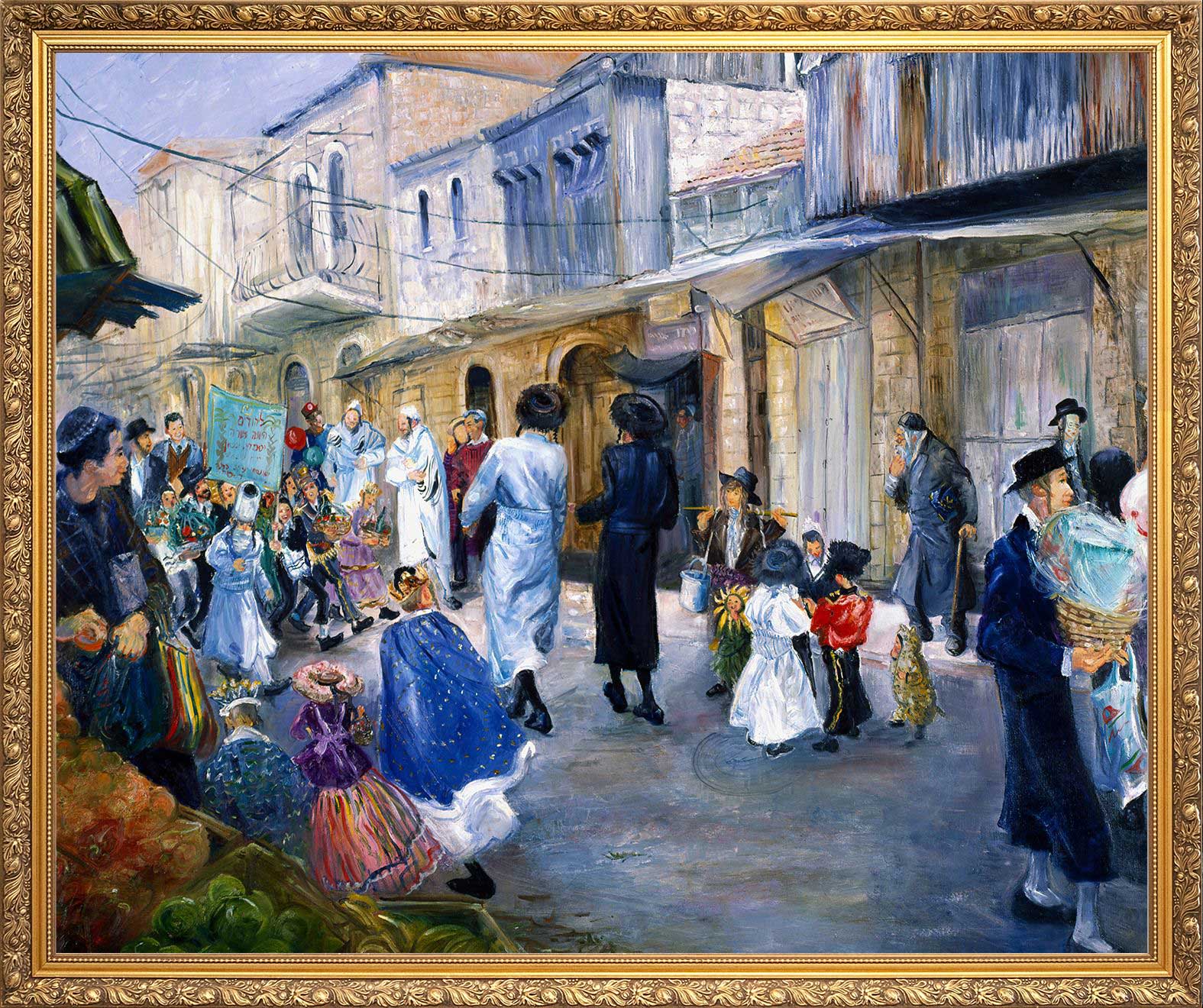 הכנסת ספר תורה ברחובות מאה שערים—המוני רקדנים שרים ומסתובבים, אנשים מלווים את ספר התורה החדש בשמחה עצומה אל בית הכנסת בקצה הרחוב. הובי צפתה באירוע הזה מהמרפסת שלה, והתרגשות שהציפה אותה הפכה מיד ליצירה. הציור המרהיב מעביר את האקסטזה והאושר של הרגע—את האהבה המורגשת של אלו שזכו לחבק את הספר הקדוש. שמחה יהודית אמיתית בשיאה!