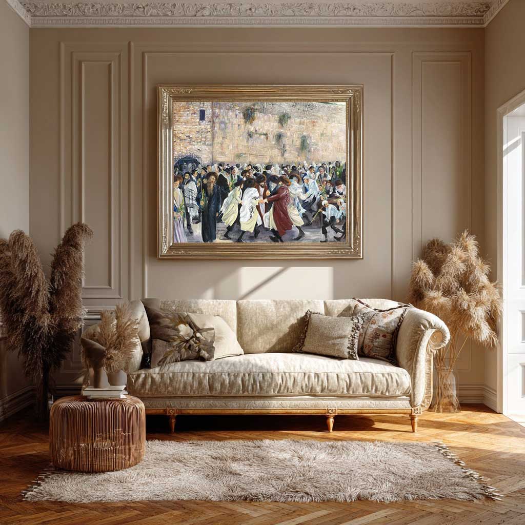 ארבעת המינים הנישאים בידי הגברים מסגירים כי מדובר בשמחת חג הסוכות. זהו החג היחיד בו אנו מצווים להיות בשמחה, והריקוד הספונטני במקום הקדוש ביותר לעם היהודי משקפים היטב את רוח החג בירושלים. האור החולמני מדגיש את אווירת השמחה המשולבת ביראת האל.