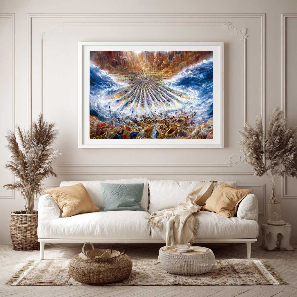 A breathtaking panoramic view of the splitting of the Red Sea, showcasing thousands of Israelites streaming through the miraculous pathway. Huvy captures the monumental scale of the Exodus with towering walls of water on both sides and divine light radiating from above. The Egyptian chariots in the foreground add drama and urgency to this pivotal moment of redemption and faith.