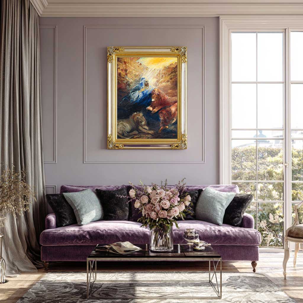 An intimate portrayal of the prophet Daniel surrounded by lions in divine protection. Huvy’s luminous brushwork illuminates Daniel’s serene face as heavenly light streams down upon him. The peaceful lions at his feet symbolize God’s miraculous intervention. Rich blues and golden tones create a sense of spiritual transcendence in this moment of faith and salvation.