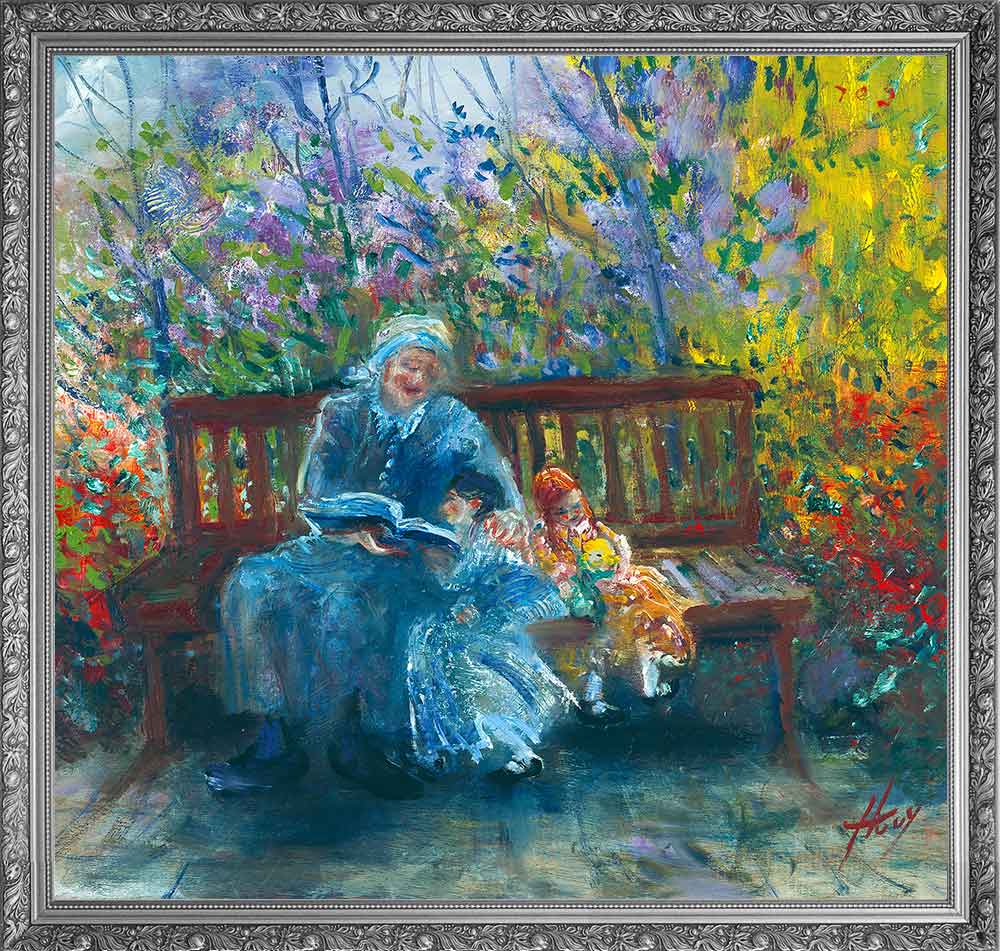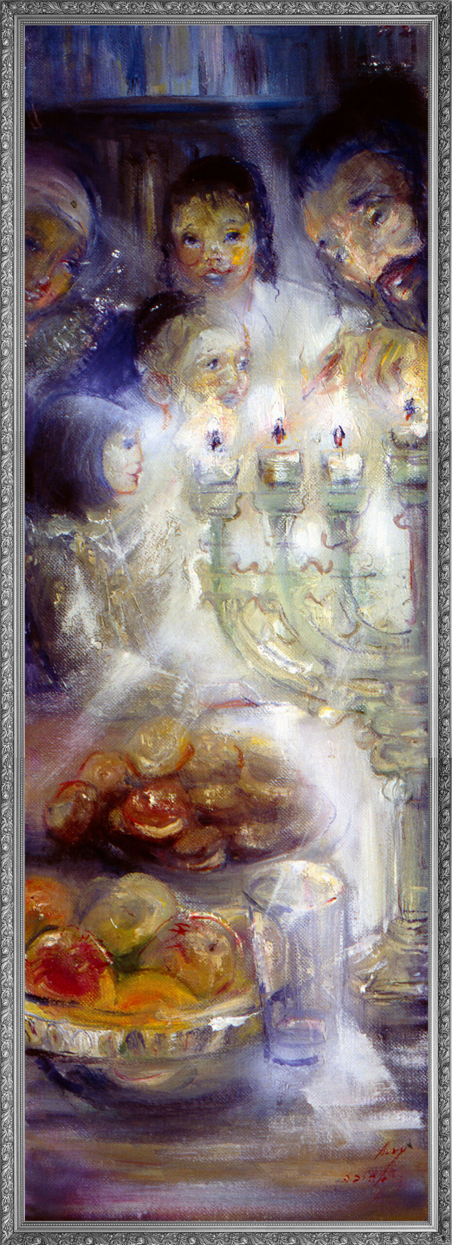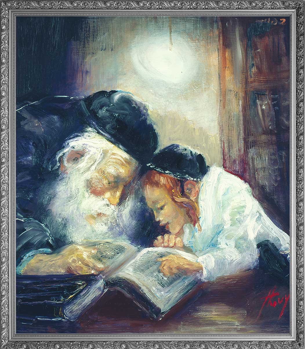 A powerful depiction of the Exodus story, capturing the miraculous moment when the Children of Israel cross through the parted Red Sea. Huvy’s masterful use of swirling blues and golden light creates a sense of divine intervention and movement. In the foreground, Moses and the Israelites with their chariots and belongings rush forward, while masses of people stream through the towering walls of water. The dramatic sky and luminous pathway through the sea convey both the peril and the miracle of this defining moment in Jewish history.