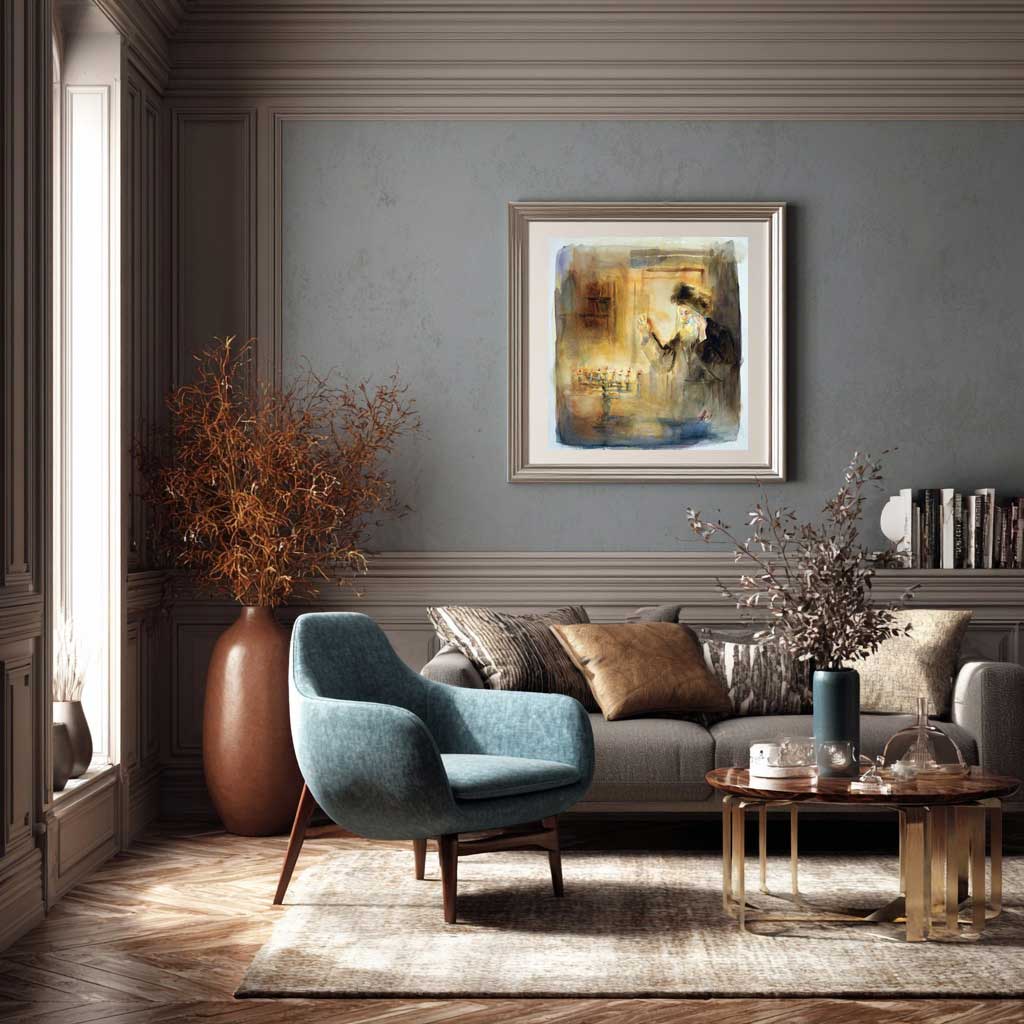 A joyful moment of Chanukah celebration radiating authentic happiness. A Hasidic man stands before the glowing menorah, his expression conveying genuine delight and spiritual warmth. Huvy’s soft, luminous rendering captures the beautiful simplicity of the holiday—the pure joy of lighting candles and honoring tradition. Amber and golden tones create an atmosphere of contentment, embodying the spirit of Chanukah in its most heartfelt form.