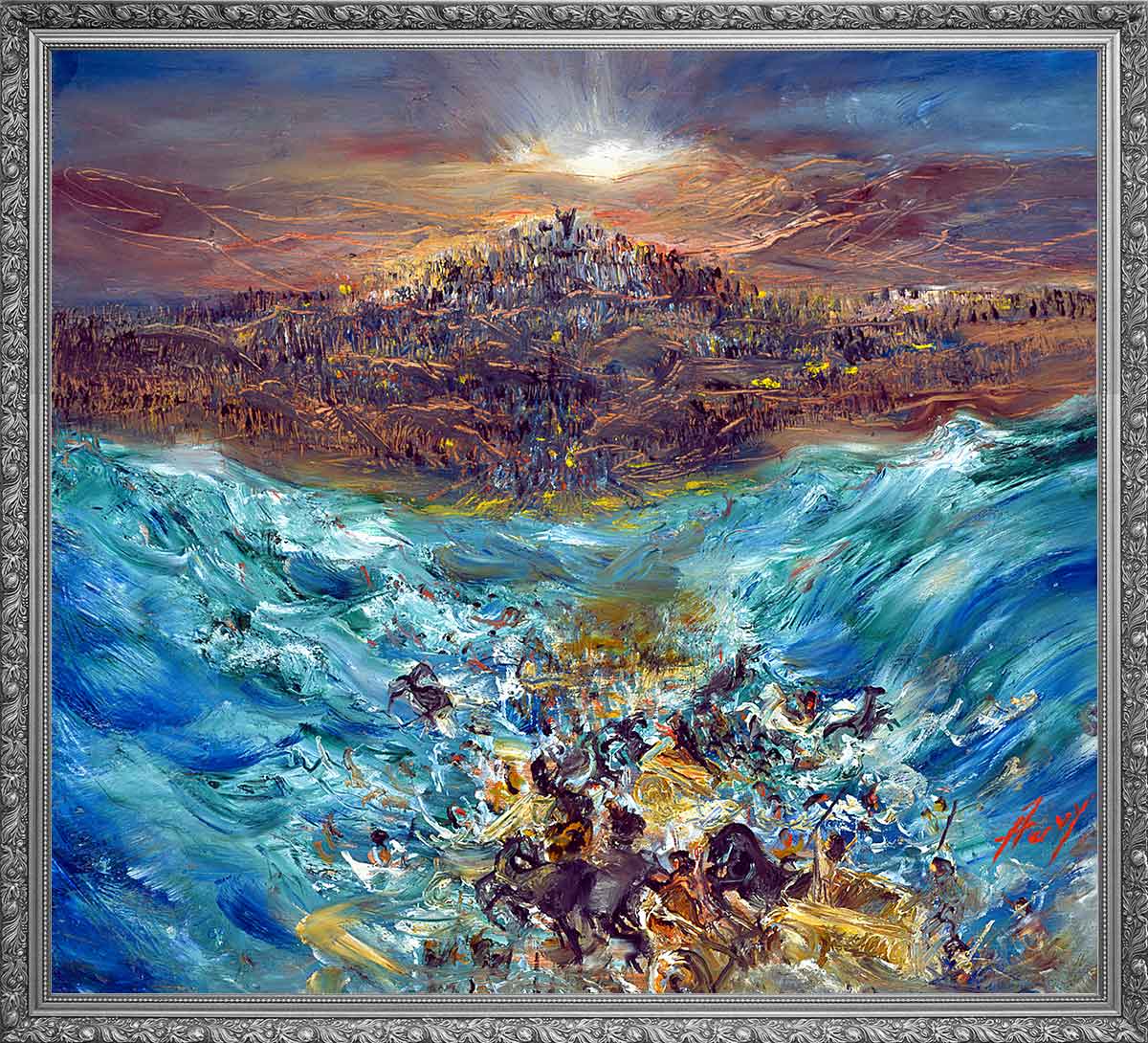 the iconic painting of Moses, standing before the Jewish people streaming out of slavery in Egypt into the unknown desert, is full of emotion. the threatening desert looming above them, the gleaming light of hope, the bravery of the newly redeemed people becoming a nation