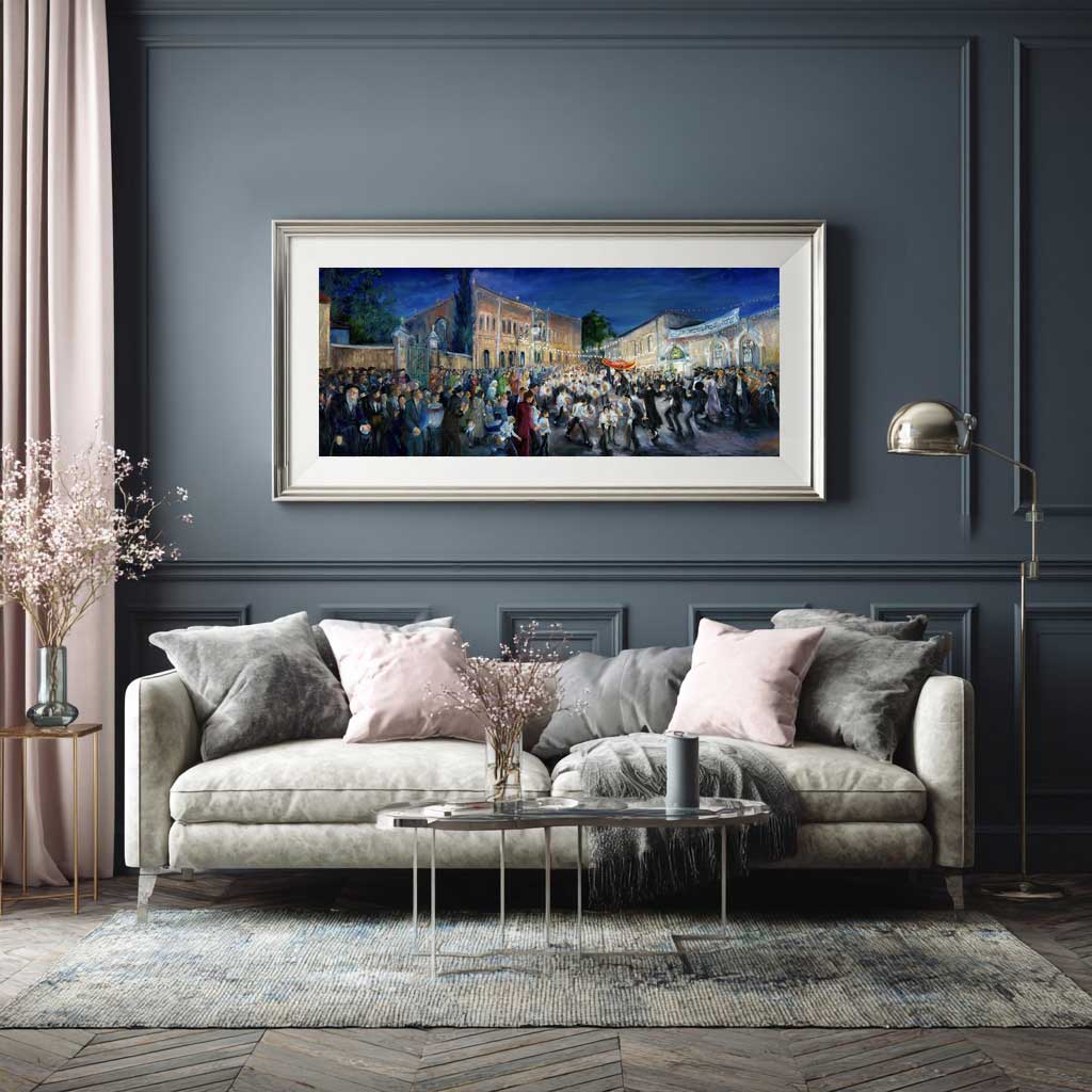 A live Hachnassat Sefer Torah event that Huvy once witnessed from the balcony of her home in Meah Shearim immediately inspired her to transform the lingering sentiments of joy and emotion into art. The result was a spectacular painting that conveys the ecstasy and bliss of this event—the masses of singing and twirling dancers, the love felt by those privileged to embrace the brand new Sefer Torah as they parade it through the streets to its future home in the Ark of a beit knesset at the end of the street. Truly Jewish joy at its peak!