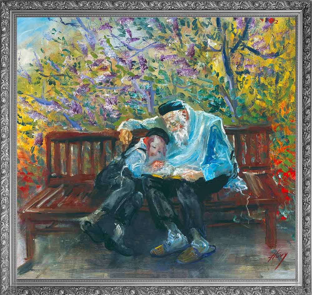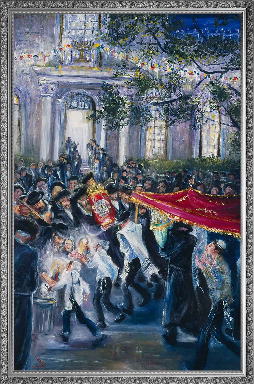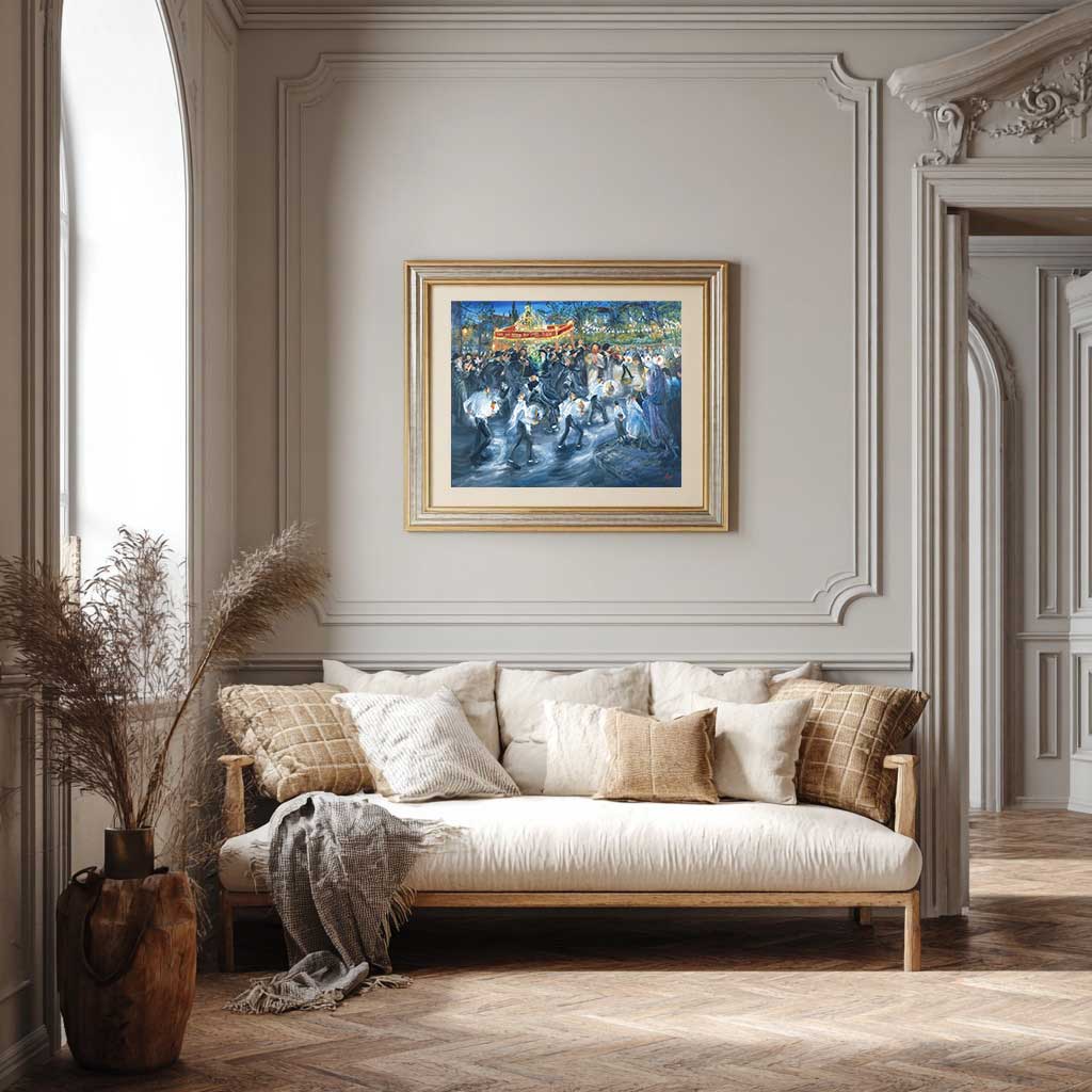 A live Hachnassat Sefer Torah event that Huvy once witnessed from the balcony of her home in Meah Shearim immediately inspired her to transform the lingering sentiments of joy and emotion into art. The result was a spectacular painting that conveys the ecstasy and bliss of this event—the masses of singing and twirling dancers, the love felt by those privileged to embrace the brand new Sefer Torah as they parade it through the streets to its future home in the Ark of a beit knesset at the end of the street. Truly Jewish joy at its peak!
