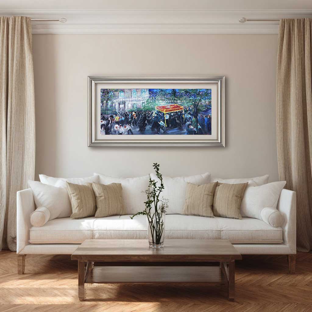A live Hachnassat Sefer Torah event that Huvy once witnessed from the balcony of her home in Meah Shearim immediately inspired her to transform the lingering sentiments of joy and emotion into art. The result was a spectacular painting that conveys the ecstasy and bliss of this event—the masses of singing and twirling dancers, the love felt by those privileged to embrace the brand new Sefer Torah as they parade it through the streets to its future home in the Ark of a beit knesset at the end of the street. Truly Jewish joy at its peak!