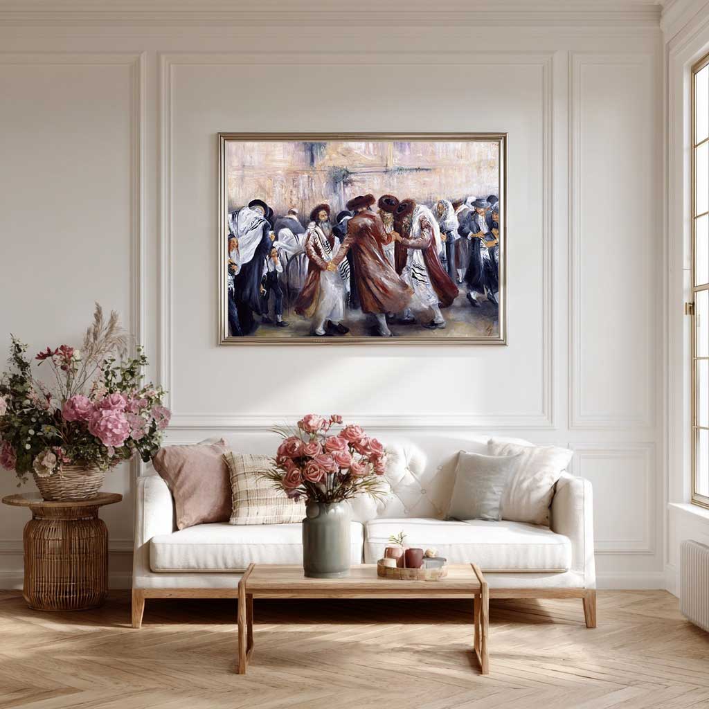 A spirited scene capturing Hasidic Jews in ecstatic dance at the Western Wall. Huvy’s dynamic brushwork conveys the rhythmic movement of figures wrapped in flowing tallitot and traditional attire, their forms merging in joyful motion. The soft, luminous background of ancient Jerusalem stone provides a sacred backdrop to the vibrant energy of the dancers, expressing the deep devotion and spiritual celebration that defines Jewish worship at this holiest site.