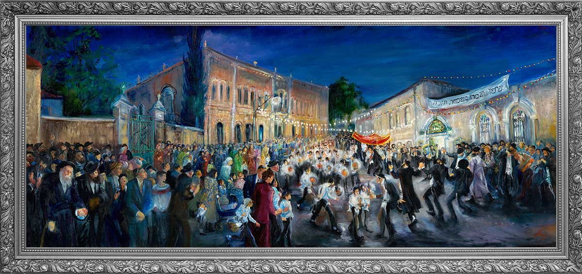 Jerusalem viewed from the surrounding hills, where verdant valleys and cypress groves frame the ancient city in the distance. Huvy captures a quieter Jerusalem—serene stone houses with terracotta roofs nestle among the greenery, while the Old City rises on the horizon. The gentle interplay of greens, blues, and golden earth tones creates a harmonious vision of the Holy City at peace.