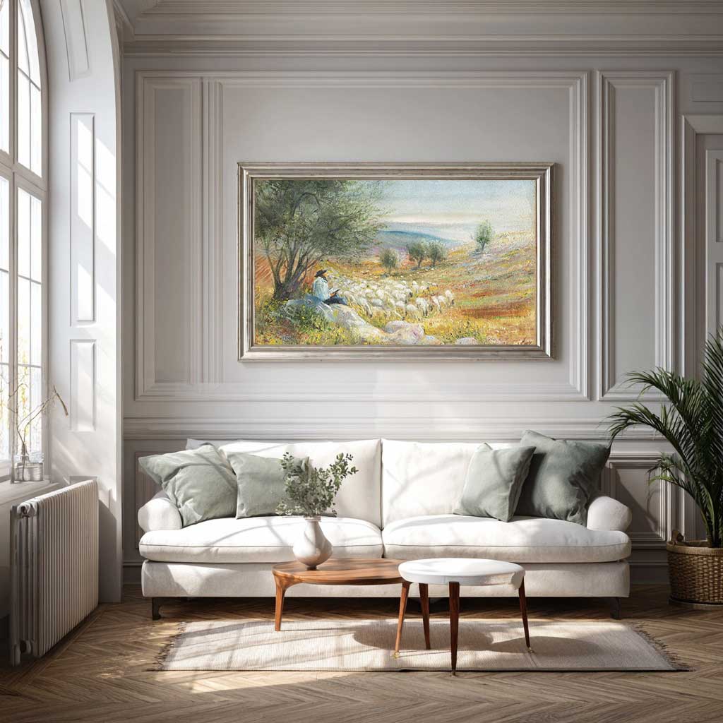 A pastoral scene in the Judean hills surrounding Jerusalem—a shepherd rests beneath an ancient olive tree while his flock grazes among wildflowers. The soft, sun-drenched landscape evokes biblical times, when these same hills witnessed the stories of our ancestors. Huvy’s delicate rendering captures the timeless simplicity of shepherd life against Jerusalem’s eternal backdrop.