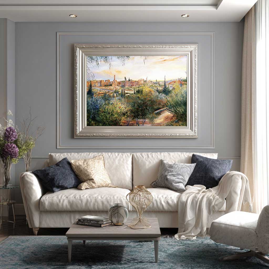 This early stage painting shows the old city and its surroundings as seen from Mt. Zion. Huvy’s dreamy but bold style is already apparent, in the fiery edges of the walls of the city to the olive tree in a dreamy blur, stirred by the wind. ‘Jerusalem is no longer so green, but this is how it must be remembered.