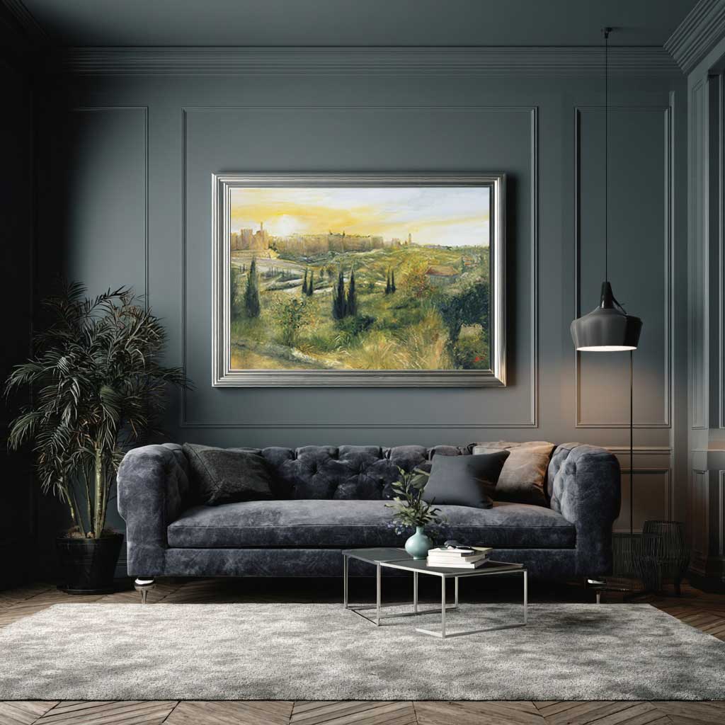 A sweeping panoramic view of Jerusalem’s ancient walls bathed in golden sunset light. Cypress trees stand sentinel in the foreground as the city’s iconic ramparts rise majestically against a luminous sky. Huvy’s warm palette captures the eternal beauty of Jerusalem—where ancient stone meets rolling hills, and every shadow tells a story of centuries past.