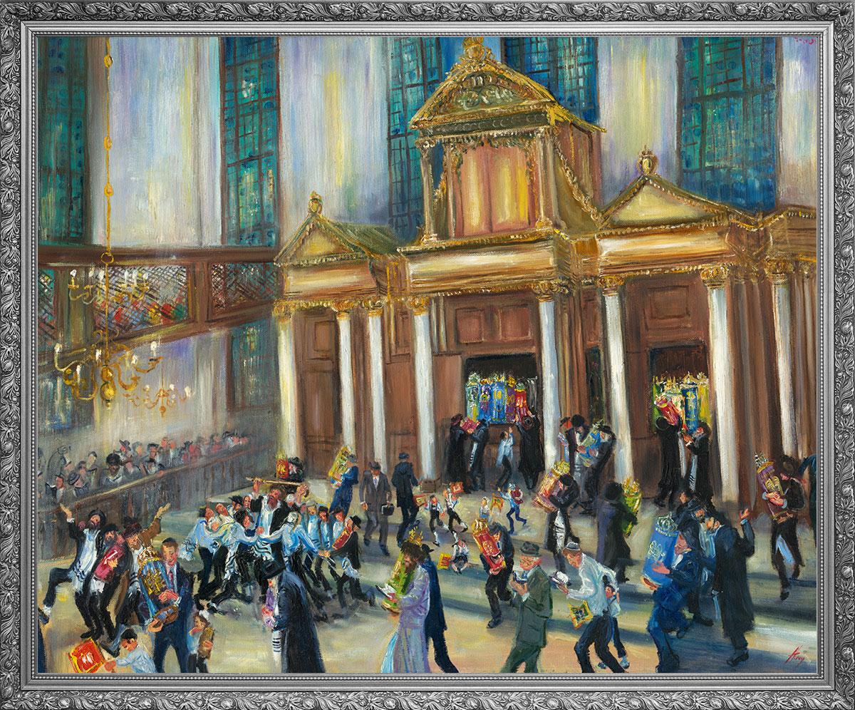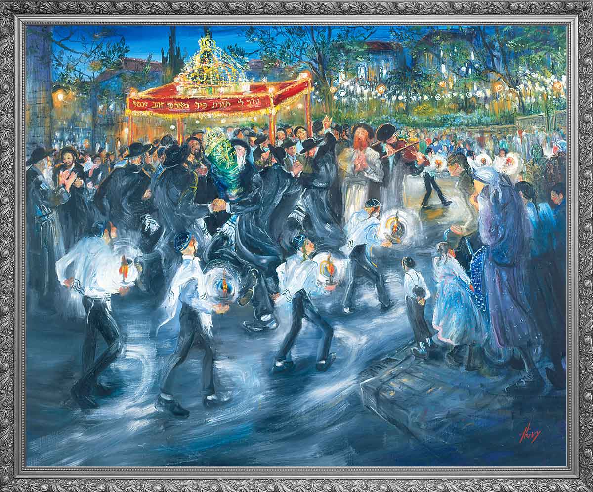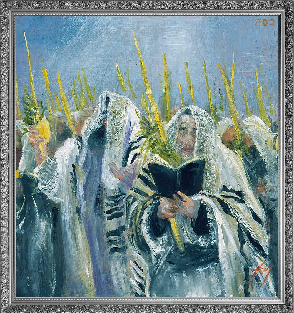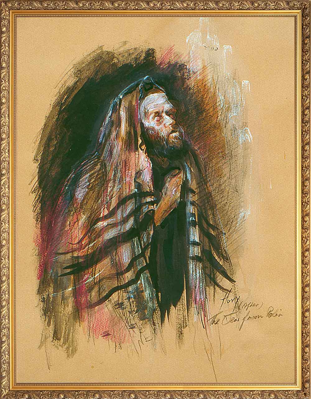 A figure stands in prayer, wrapped in tallit and tefillin, his gaze lifted heavenward. Huvy’s expressive sketch captures a moment of intimate devotion—the stripes of the tallit and the leather straps of tefillin rendered with bold, reverent strokes. This is prayer as pure connection between man and Creator.