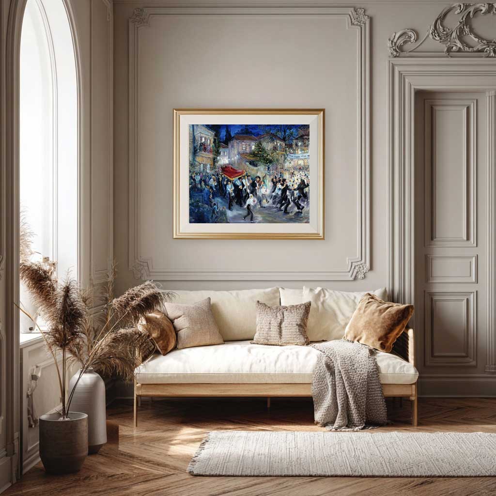 A live Hachnassat Sefer Torah event that Huvy once witnessed from the balcony of her home in Meah Shearim immediately inspired her to transform the lingering sentiments of joy and emotion into art. The result was a spectacular painting that conveys the ecstasy and bliss of this event—the masses of singing and twirling dancers, the love felt by those privileged to embrace the brand new Sefer Torah as they parade it through the streets to its future home in the Ark of a beit knesset at the end of the street. Truly Jewish joy at its peak!