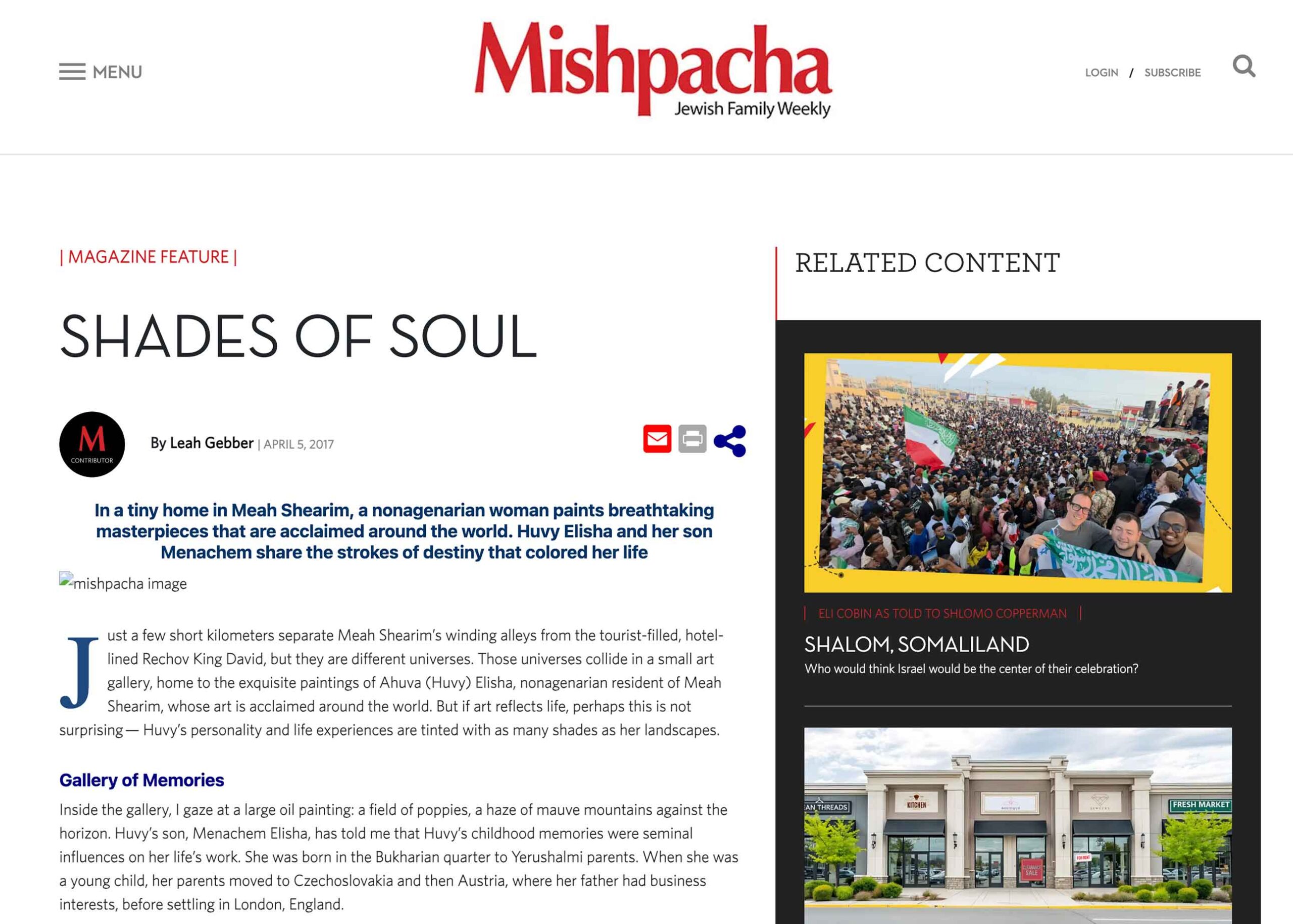 ust a few short kilometers separate Meah Shearim’s winding alleys from the tourist-filled, hotel-lined Rechov King David, but they are different universes. Those universes collide in a small art gallery, home to the exquisite paintings of Ahuva (Huvy) Elisha, nonagenarian resident of Meah Shearim, whose art is acclaimed around the world. But if art reflects life, perhaps this is not surprising — Huvy’s personality and life experiences are tinted with as many shades as her landscapes.