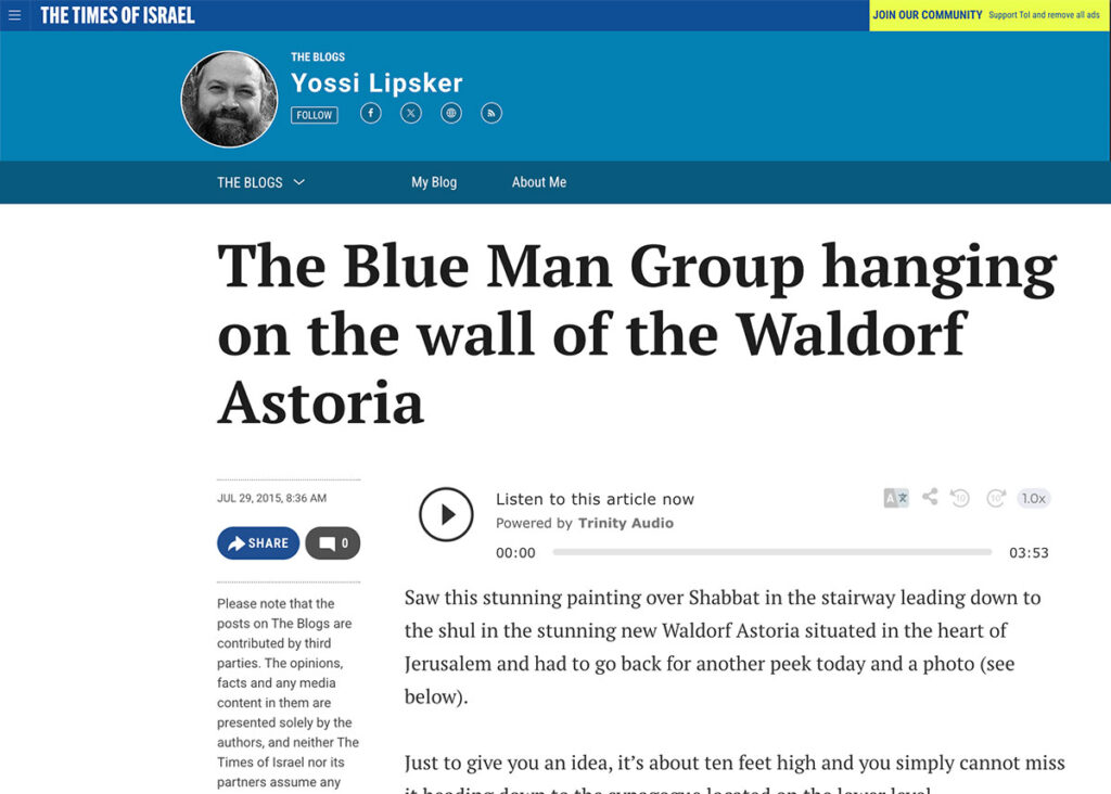 Saw this stunning painting over Shabbat in the stairway leading down to the shul in the stunning new Waldorf Astoria situated in the heart of Jerusalem and had to go back for another peek today and a photo (see below).